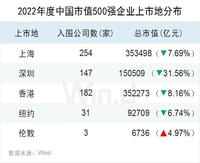 2022年度,因股市整體回調,上(shàng)市公司股價集體走弱,入圍公司總市值亦出現(xiàn)明(míng)顯下(xià)降,其中,上(shàng)海入圍公司總市值3.53萬億元,下(xià)降7.69%;深圳入圍公司總市值1.51萬億元,下(xià)降31.56%;香港入圍公司總市值3.52萬億元,下(xià)降8.16%;紐約入圍公司總市值9.27萬億元,下(xià)降6.74%。