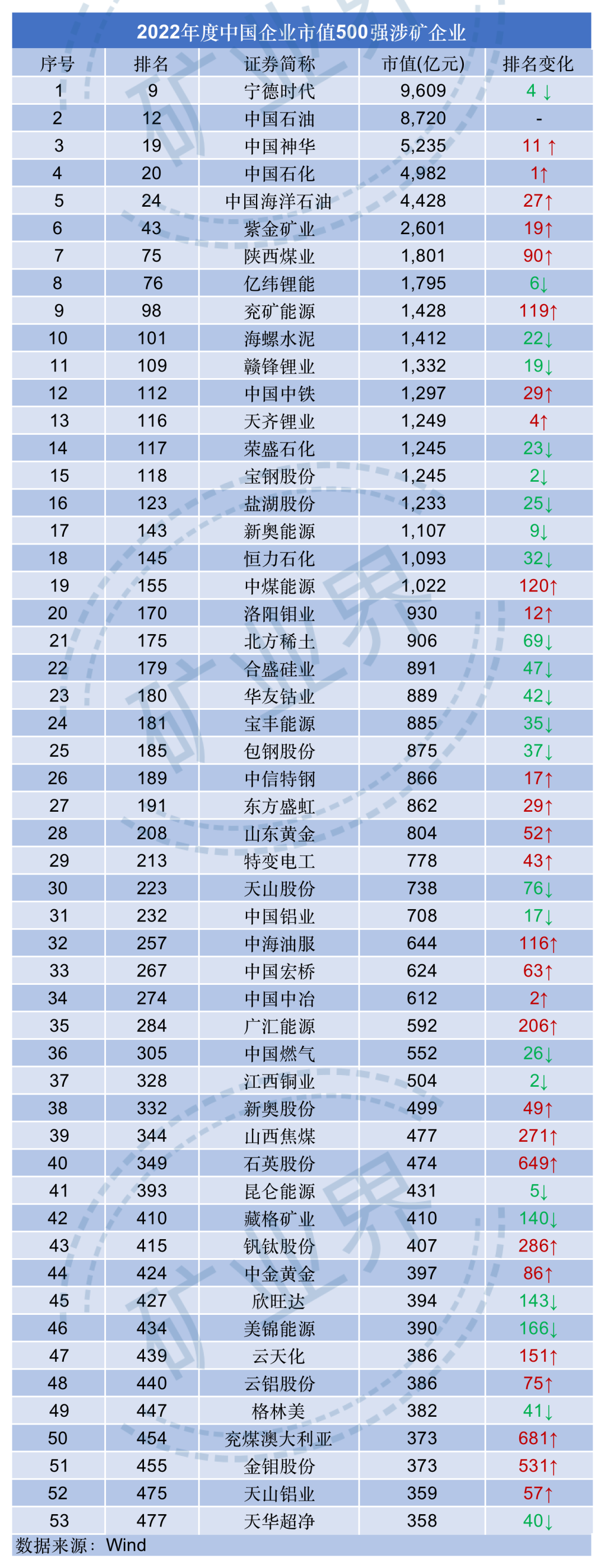 近日,Wind發布了(le)2022年度“中國上(shàng)市企業市值500強”榜單,礦業界梳理(lǐ)發現(xiàn),共有53家涉礦企業入圍排行榜,其中甯德時(shí)代、中國石油、中國神華市值排名涉礦企業前三。