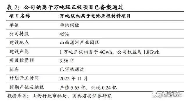 據山西轉型綜改示範區(qū)行政審批局2022年度 7 月企業投資項目備案結果公示表,公司萬噸級鈉離子電池正極材料項目已審核通過,且 11 月開(kāi)工(gōng)。