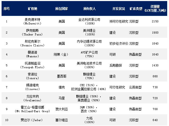 根據總資源量(LCE,碳酸锂當量,萬噸,以下(xià)同),Mining Intelligence網站(zhàn)列出了(le)世界前十大(dà)粘土和(hé)硬岩锂礦。