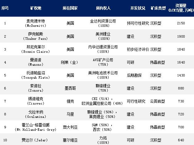 根據總資源量(LCE,碳酸锂當量,萬噸,以下(xià)同),Mining Intelligence網站(zhàn)列出了(le)世界前十大(dà)粘土和(hé)硬岩锂礦。