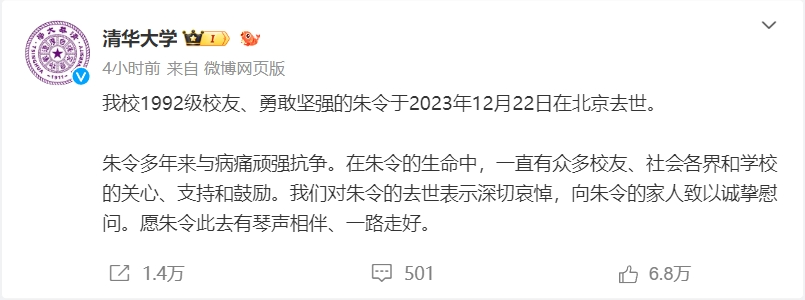 清華表示,朱令多年來(lái)與病痛頑強抗争。在朱令的生命中,一直有衆多校友、社會(huì)各界和(hé)學校的關心、支持和(hé)鼓勵。“我們對(duì)朱令的去世表示深切哀悼,向朱令的家人緻以誠摯慰問。願朱令此去有琴聲相伴、一路走好(hǎo)。”