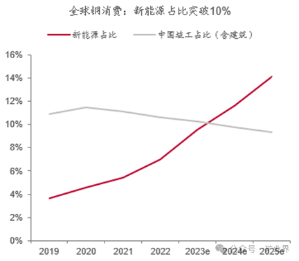 新能(néng)源領域對(duì)銅需求的增量,已基本上(shàng)抵消了(le)國内傳統房地産下(xià)滑所帶來(lái)的負面影響。近日,中泰證券研究所有色金(jīn)屬首席分析師謝(xiè)鴻鶴曾表示,2023年全球新能(néng)源制造對(duì)銅鋁的消費量已經占到(dào)總消費量的10%,而國内房地産竣工(gōng)端對(duì)銅鋁(指狹義的直接使用(yòng)部分)的消費也(yě)在2023年被“壓縮”到(dào)了(le)10%附近。