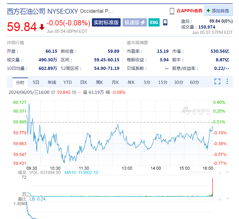 西方石油公司收報(bào)59.84美(měi)元,跌幅0.08%,市值530.56億美(měi)元。