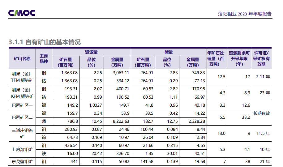 根據洛陽钼業2023年年報(bào),公司擁有多個優質礦山資源。其中,國内三座,分别是上(shàng)房溝钼礦、三道(dào)莊钼礦和(hé)東戈壁钼礦。此外(wài),公司在海外(wài)還有四座礦山。除了(le)剛果(金(jīn))的TFM和(hé)KFM兩座礦山外(wài),還有巴西的铌礦和(hé)磷礦。其中,TFM是全球最大(dà)的銅钴礦之一,KFM是全球第一大(dà)钴礦,巴西铌礦是世界第二大(dà)铌礦。