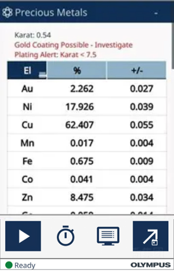 如圖所示,透過Vanta GX 貴金(jīn)屬分析儀驗證金(jīn)飾時(shí),得知(zhī)此金(jīn)飾的純金(jīn)含量隻有2.262%的黃金(jīn)(Au)含量,但(dàn)鎳(Ni)含量爲17.926%、銅(Cu)含量高(gāo)達62.407%。故可得知(zhī)此金(jīn)飾爲俗稱白(bái)銅的鎳銅合金(jīn),鍍金(jīn)上(shàng)一層薄薄的黃金(jīn),因爲Vanta GX除了(le)告知(zhī)金(jīn)屬含量爲何外(wài),若有遇到(dào)樣品疑似有鍍金(jīn)(Coating)的狀況,也(yě)都會(huì)在窗口中一并告知(zhī)(如圖上(shàng)方的紅(hóng)色警告字語)。