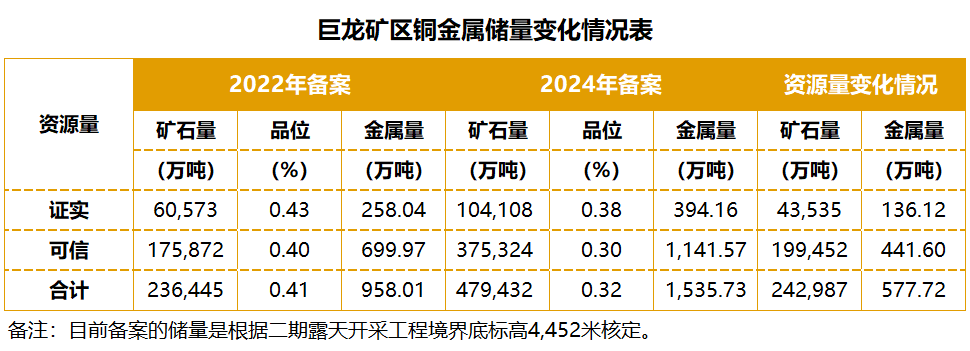 根據新的評審意見,巨龍礦區(qū)新增銅資源量達1472.6萬噸。新增備案完成後,巨龍銅礦銅資源量達2588萬噸,平均品位0.29%,約爲公司2020年并購時(shí)核實資源量的2.5倍,也(yě)是中國目前備案資源量最多的銅礦山。另新增伴生資源钼資源量100.2萬噸、銀資源量8157噸。